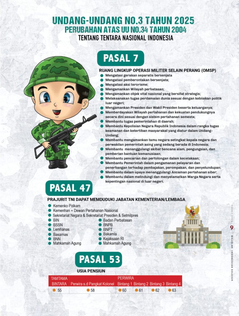 La rivista riprende i due articoli più importanti della legge no. 3 del 2025 (che ha modificato la legge n. 34 del 2004), i numeri 7 e 47, che definoscono, rispettivamente, i Ruang Lingkup Operasi Militer Selain Perang, gli ambiti delle Operazioni Militari Diverse dalla Guerra (OMSP), e gli incarichi che possono essere assunti dalle forze armate.
