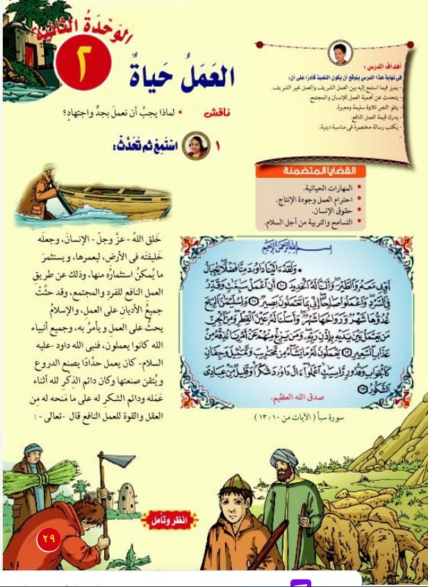 I manuali scolastici, in particolare, insistono sul legame tra valori civici e l’Islam, proposto come unica religione (di fatto), o comunque superiore rispetto alle altre; la pagina sopra riportata esorta al lavoro manuale, indicandolo come un dovere e un atto di culto islamico. Un bambino copto, evidentemente, si sentirà escluso da questa nozione, oppure non completamente incluso in questa narrativa, che tende ad escludere la diversità religiosa.