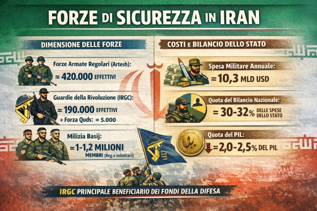 Nota: dati stimati su base open source; le cifre reali possono variare per opacità del bilancio iraniano.