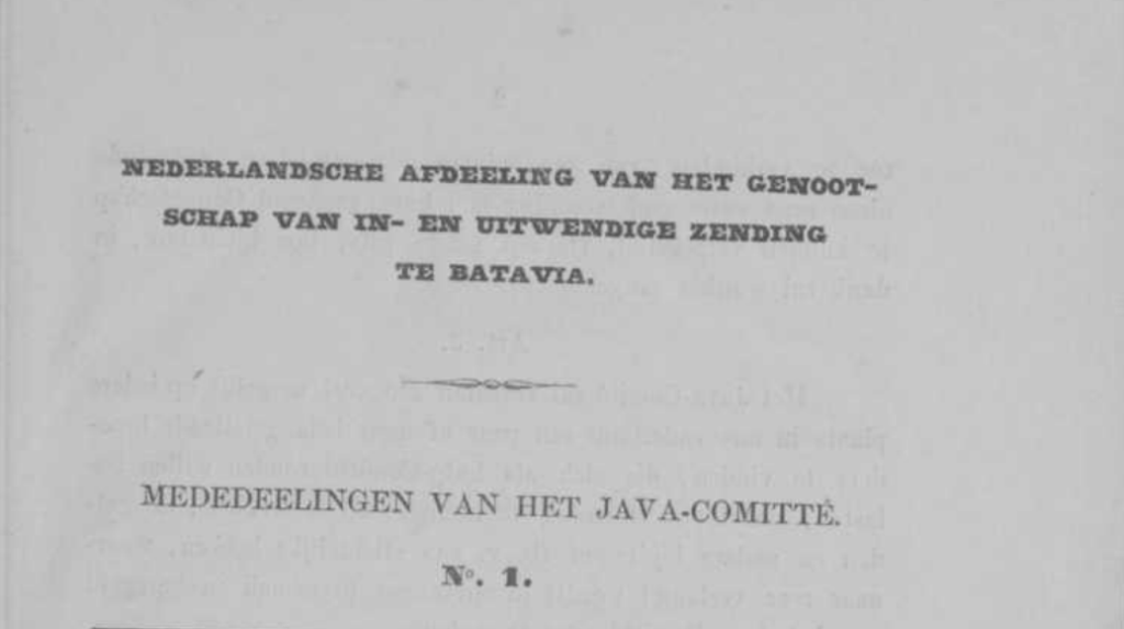 Il Comitato (di) Java, con sede ad Amsterdam, si ritiene fortunato, dopo la pubblicazione del suo Roepstem (appello, ndr) ai Cristiani nei Paesi Bassi per la proclamazione del Vangelo a Java *), di poter comunicare che, sulla base delle disposizioni in esso contenute, è stata costituita una Sezione Olandese della Società di Missione Interna ed Esterna a Batavia sotto la benedizione del Signore.