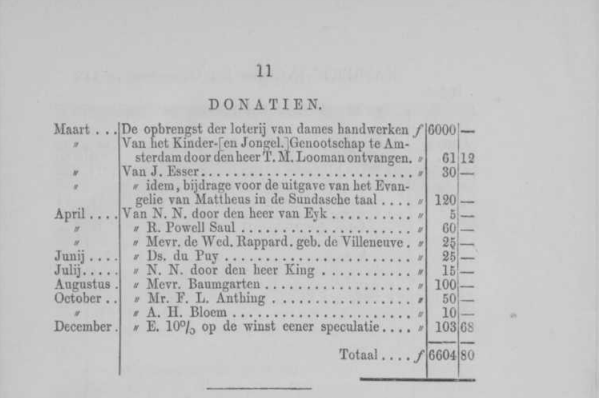 L’immagine riportata dalla prima edizione delle ‘Comunicazioni del Java Comité’ riporta le donazioni ricevute, probabilmente nell’anno precedente, da marzo a dicembre; in questo periodo sarebbero stati raccolti 6.600 fiorini, una cifra che, aggiustata per il potere di acquisto attuale corrisponderebbe a circa 70-90 mila Euro.
