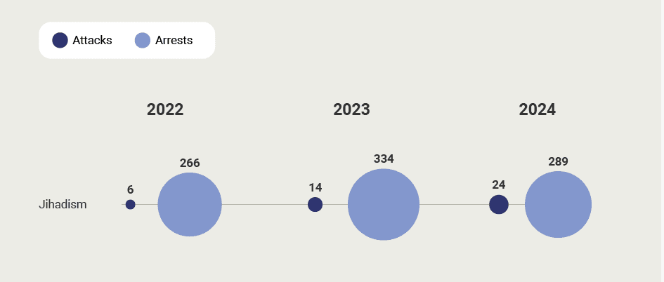 Come si evince dal grafico riportato sopra (Fonte: Europol, 2025) il numero di attacchi terroristici (anche solamente pianificati) è aumentato stabilmente tra il 2022 (6) e il 2024 (24); il numero di arresti, invece, dopo un aumento tra il 2022 (266) e il 2023 (334) sono diminuiti nel 2024 (289).