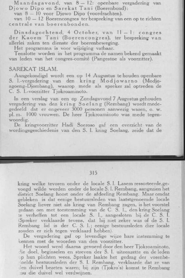 La parola fu poi presa dal signor Tjokroaminoto, che espose gli scopi, i principi e le aspirazioni della S. I. e indicò ai membri i loro doveri. Il relatore condannò il comportamento dei suddetti membri del consiglio di amministrazione della S. I. Rembang, dichiarando che erano posseduti dal diavolo; con l’arrivo di Tjokro a Rembang, quel diavolo sarebbe scomparso (…)