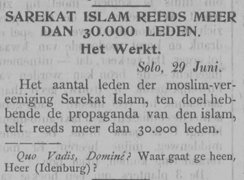Viene annunciata una riunione pubblica del circolo di Mojowarno (…) In un rapporto di una riunione del circolo Soelang (Rembang) tenuta la sera di domenica 7 agosto, si riferisce che erano presenti circa 3000 persone, tra cui circa 1000 donne. Il signor Tjokroaminoto era presente anche lui. (…) L’assemblea ha espresso vivacemente il suo consenso alle parole del presidente.